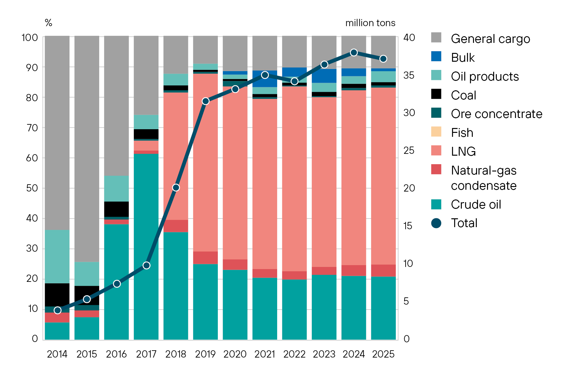 Грузооборот по Северному морскому пути в 2025 году составил 37,02 млн тонн, что на 2,3% ниже показателя предыдущего года. В предыдущий раз снижение грузооборота наблюдалось в 2022 году в результате российского вторжения в Украину. Структура грузов осталась прежней: 58% СПГ, 24% нефть и нефтепродукты, 11% генеральный груз, 4% газоконденсат, остальное – уголь, рудоконцентрат, навалочные грузы и рыба.